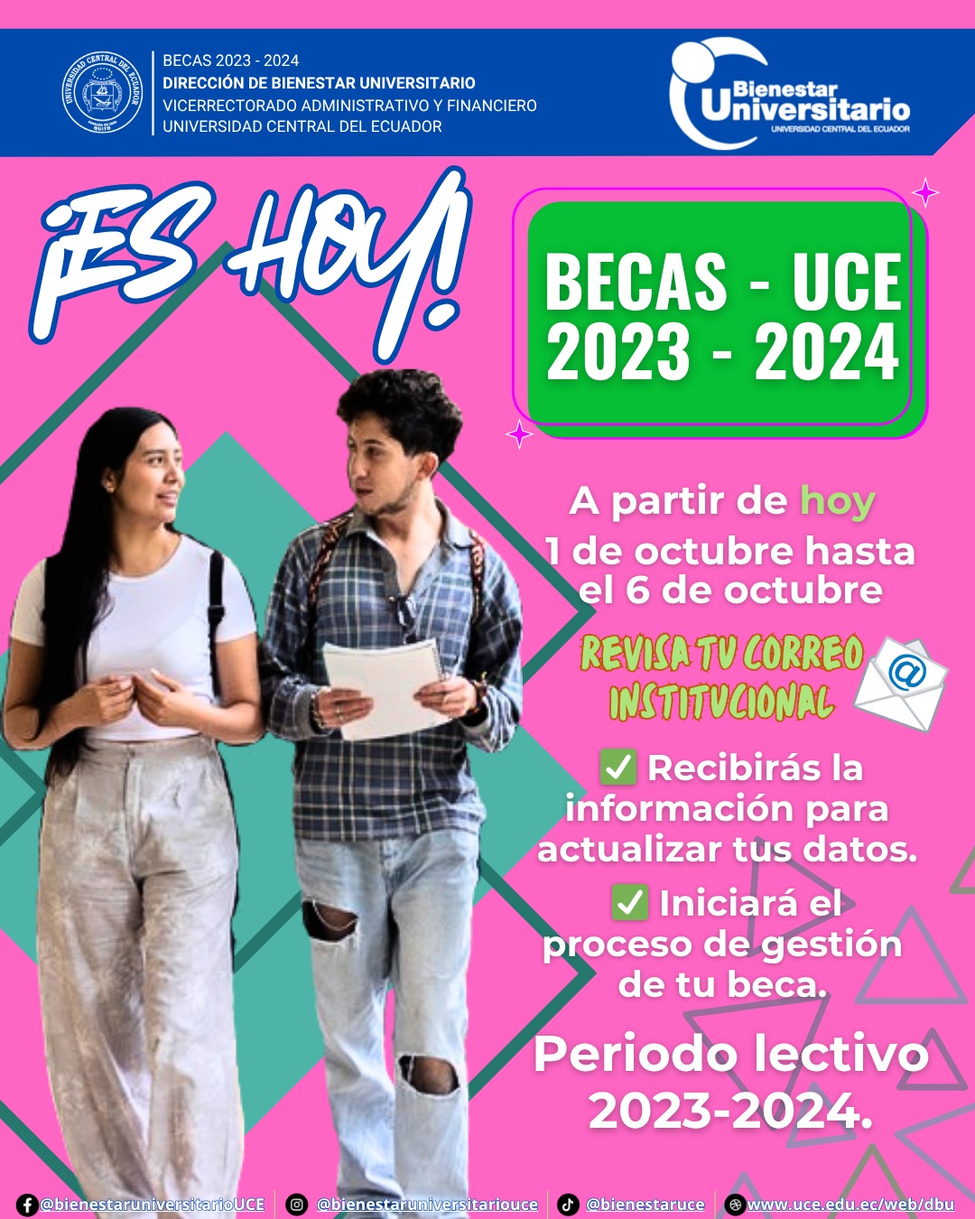 Desde hoy hasta el 6 de octubre 🔥 debes estar súper pendiente de tu correo institucional 📧 porque ahí recibirás el enlace para: ✅ Actualizar tus datos ✅ Subir tu certificado bancario digital actualizado 👉 Recuerda: lee bien todas las instrucciones del correo y completa tu proceso de gestión de beca 2023-2024 🎓💻 No te quedes fuera 😉💪 #BecasUCE #BienestarUniversitario #SomosUCE #TuFuturoNuestraMeta